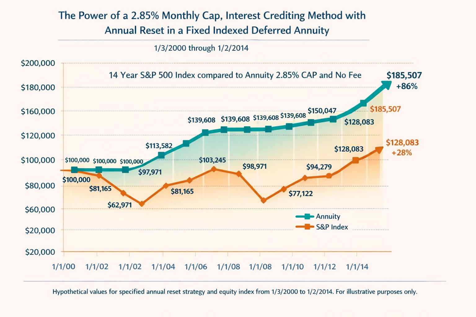 - Some products use participation rates instead (e.g., 40% of the index gain). These terms can change over time, depending on the contract.